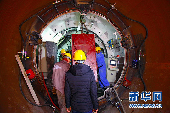 廖春林說,與傳統的盾構施工不同,黃浦江上游水源地連通管工程采取更為環保的頂管技術。頂管技術是指頂管機頭切削土體,后方由千斤頂頂進管節,頂進一定距離后,千斤頂回縮,在工作井內裝入新的管節,再頂進,如此重復,直到機頭到達接收井。