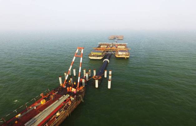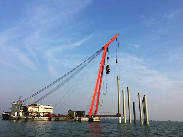 此次建設者們面對的是直徑2.6米,沉管長度228米,水深超過20米的水下鋼管鋪管施工,因為其超大直徑、超長沉管、超深水域的特點,被業界稱為國內最深水下鋪管工程,施工難度極大。項目開工之后,建設者們就遇到第一個難題,水下沉管首先需要在平均深度達到20米的湖底打下93根鋼管樁,以3根為一橫排,豎排31根要保持在一個直線上,以便水下沉管固定安裝。由于水深關系,以現有彈簧振動樁錘或者液壓式沖擊錘,難以達到深水樁基進度要求,為此,建設者們創新研制了新型深水樁基送樁器,其本體由上、下兩部分組成,上部分采用上部鋼管,在所述上部鋼管的外表面由上至下標有刻度尺,用于控制貫入度及施打深度;下部分采用下部鋼管,上下兩部分通過上下部分連接件銜接,分別與上下部分鋼管焊接,在與上下部分焊接部位沿著鋼管周側等間隔設有若干加勁板。 通過新型深水樁基送樁器使用,保證了深水打樁垂直度、貫入度、樁頂標高。