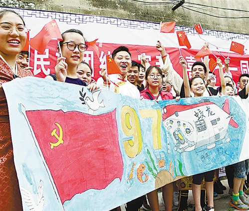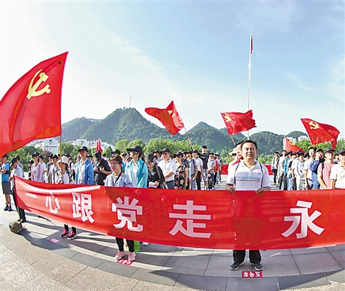 6月27日,安徽省歙縣舉辦“一心跟黨走 永遠在路上”活動迎接黨的生日。當日,200名縣直機關黨員和非公企業的黨員從縣城出發,沿著革命先烈走過的足跡,到達溪頭鎮汪滿田村紅軍紀念碑。活動中舉辦升國旗、唱國歌儀式,沿途宣傳環保、扶貧、文明創建等內容。吳建平攝