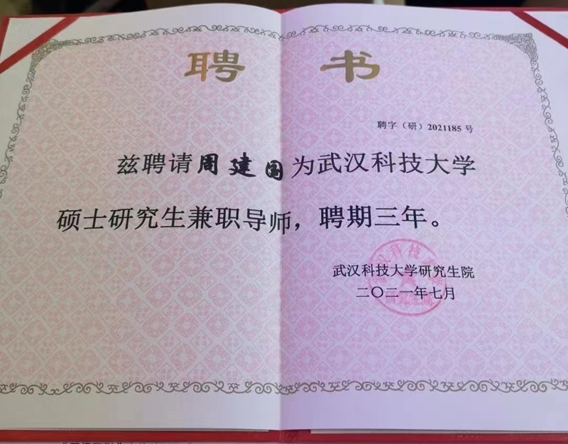 祝賀國豪耐火科技董事長周建國先生受聘為武漢科技大學碩士研究生兼職導師。