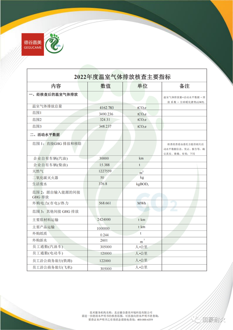 2023年3月,第三方核查機構北京德谷嘉美環境科技有限公司受江蘇國豪耐火科技有限公司委托對其2022年企業溫室氣體排放數據進行核查,出具了溫室氣體排放核查報告。